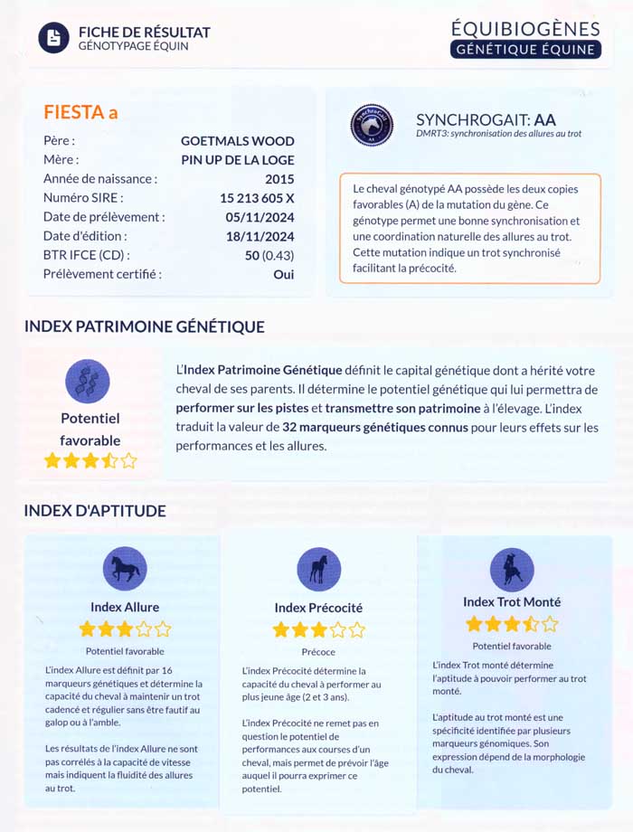 uitgebreide test, de Index. Er wordt gekeken naar de Index Patrimoine Genetique, wat zich vertaalt als de het totaal overzicht van de genetisch basis (erfenis). Het onderzoek bestaat uit drie onderdelen. De weergave is voornamelijk in sterren. Maximaal 5 sterren, 2,5 ster is het gemiddelde van de populatie (alle onderzochte dravers). Fiesta krijgt in dit onderzoek in totaal 3,5 ster en is daarmee ruim beter dan het gemiddelde. Een hele opluchting. Voor gangen krijgt ze drie sterren en dat schijnt te wijten te zijn aan Goetmals Wood, die vererft soms matige gangen. (doordat hij CA-drager is, maar hij is wel kampioen bij de pères-de-mères in Frankrijk) De index Allure zegt niets over de mogelijke snelheid van het paard, maar meer over de soepelheid van de gangen in draf. Vervolgens hebben we de Index Precocite (vroegrijpheid), die bepaalt of het paard als 2- of 3-jarige kan presteren. Fiesta krijgt 3 sterren. Dan tot slot de Index Trot Monté, de geschiktheid om uiteindelijk de Prix du Cornulier te winnen. Hier krijgt Fiesta 3,5 ster. Deze wordt bepaald door de morfologie, een moeilijk woord voor de wetenschap van de bouw van een dier. Door haar 3,5 sterren als totaal zit ze ver voorbij de meerderheid van de Franse dravers.