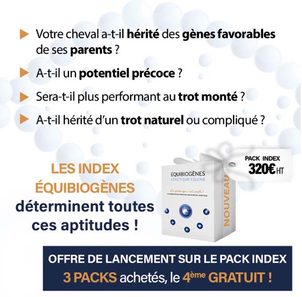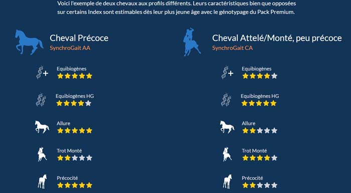 Het C of A allel heeft invloed op de zenuwcellen van een paard en daarmee zijn behendigheid bij de gangen. Het is logisch dat er meer verschillen moeten zijn tussen de Franse en de Amerikaanse draver dan alleen dat ene allel. Dat men aan de hand van C en A ook conclusies trok over de vroegrijpheid was eigenlijk “bijvangst”, want vroegrijpheid hangt af van hele andere zaken, dus van andere genen op het DNA. Dezelfde Franse onderzoekers die aan DMRT3 werkten (“SynchroGait” genaamd), hadden daardoor de beschikking over een database met de DNA-gegevens van een groot aantal koerspaarden en hebben in de afgelopen jaren andere “merkers” op het DNA gezochten gevonden, die verband houden met vroegrijpheid, uithoudingsvermogen, drafkwaliteiten, geschiktheid voor monté en andere eigenschappen. Het is gebeurd in opdracht van LeTrot en de resultaten van dit onderzoek (genaamd “GénoTrot”) zijn in april 2022 tijdens een congres van LeTrot bekend gemaakt. Er zijn 34 belangrijke genetische merkers voor dravers gevonden. Drie tot vier ervan zijn gevonden bij paarden die uitblonken in de bereden draf (monté). Enkele andere bij vroegrijpheid. Zo kon men onderscheid maken tussen verschillende types van dravers. Deze genetische merkers zijn belangrijk voor zowel de prestaties van een koerspaard als de kwaliteit van zijn draf. Ze zijn openbaar gemaakt en iedereen kan er dus gebruik van maken. Het bedrijf Equibiogènes heeft deze openbare gegevens van het GénoTrot-programma (gratis!) gebruikt om "genetische indexen”te ontwikkelen, die gemakkelijk zijn te gebruiken door elke fokker of eigenaar. Dit alles om hen te helpen om beter te selecteren. Je kunt er jaarlingen mee indelen en daarna helpt het bij het nemen van beslissingen, zoals: wie gaat het paard trainen, hoe moet het worden getraind, op welke leeftijd debuteren, in wat voor soort koersen, etc. Ook fokmerries kunnen op deze manier worden ingedeeld en daar kunnen de gewenste dekhengsten bij worden gezocht. Equibiogènes identificeert welke genen gunstig zijn voor bepaalde vaardigheden. Op basis van deze gegevens heeft men een algoritme gemaakt dat vijf index-waardes creëert die de kwaliteiten van het betreffende paard in kaart brengen.