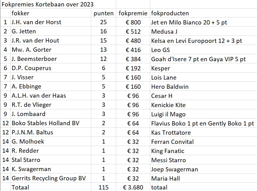 De Fokkersvereniging gaat met ingang van 2018 zorgen voor fokpremies voor de fokkers van de NL-kortebaners, die de meeste punten hebben vergaard aan het einde van een kortebaanseizoen. We zullen proberen om hiervoor sponsors te vinden en garanderen vooralsnog een minimum bedrag van € 1.000. Mogelijk wordt dit in de komende jaren meer. Voor de 5 hoogst geplaatste NL-dravers qua puntentelling bedraagt de fokpremie van boven af: 50% - 20% - 15% - 10% - 5% van het totale sponsorbedrag.