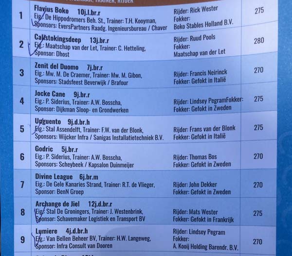 Voor de 7 hoogstgeplaatste NL-paarden in het eindklassement over 2019 zijn de fokpremies als volgt vastgesteld: