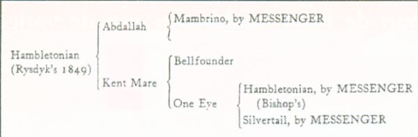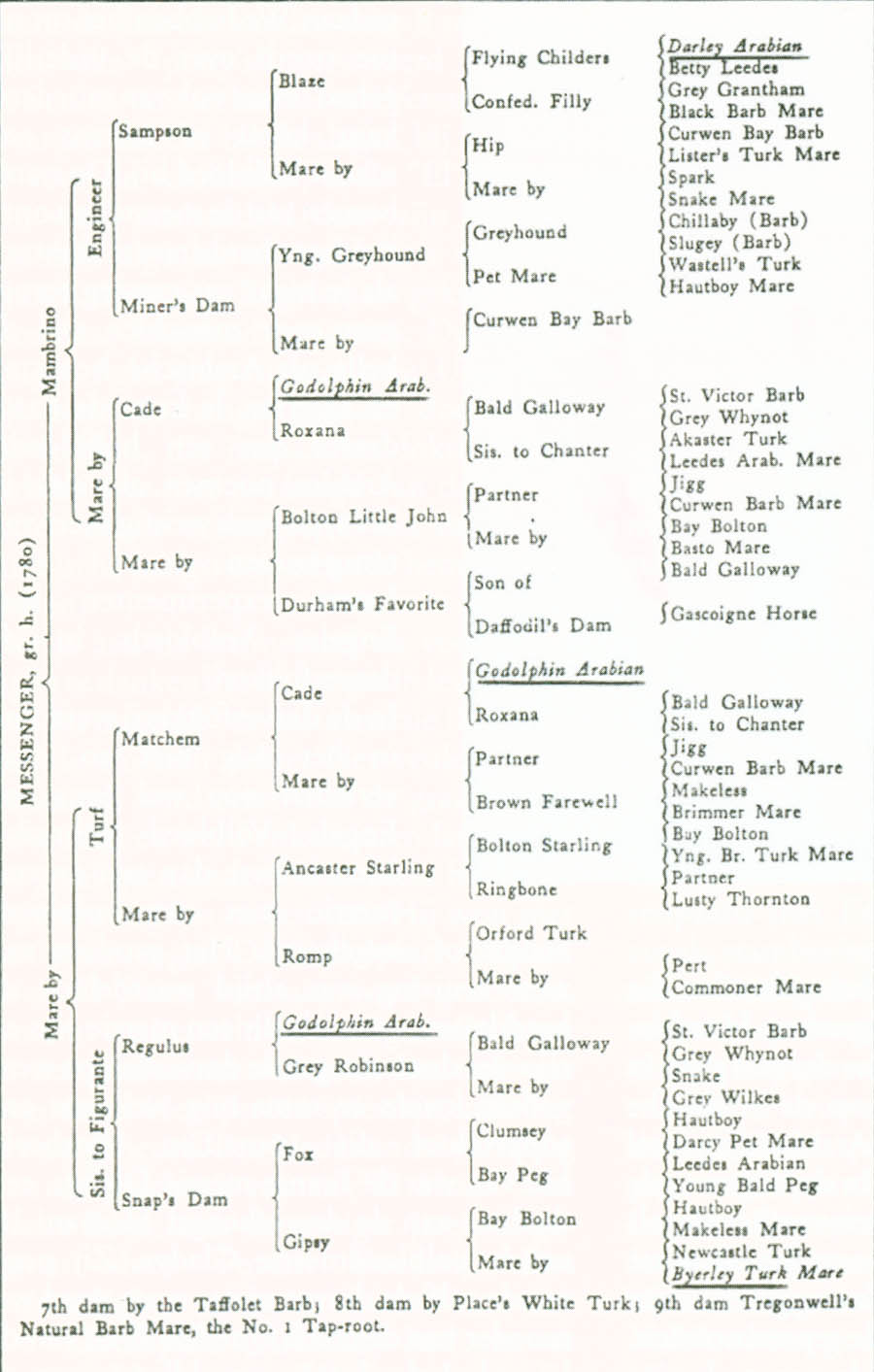 De stamboom van Messenger bestaat voor meer dan 90 % uit Arabisch bloed en hierin komen ook de Byerley Turk (wat verder weg) en vooral de Godolphin Arabian verschillende malen voor. Ter illustratie wordt hierboven de stamboom van Messenger afgedrukt. Het lijkt allemaal ver weg, maar als men bedenkt dat er in al die generaties ontzettend op veel hengsten als Messenger en Hambletonian 10 is ingeteeld, kan men zich het grote belang van het Arabisch Volbloed voor de draverfokkerij voorstellen. Dit geldt niet alleen voor de Amerikaanse maar ook voor de Franse fokkerij.