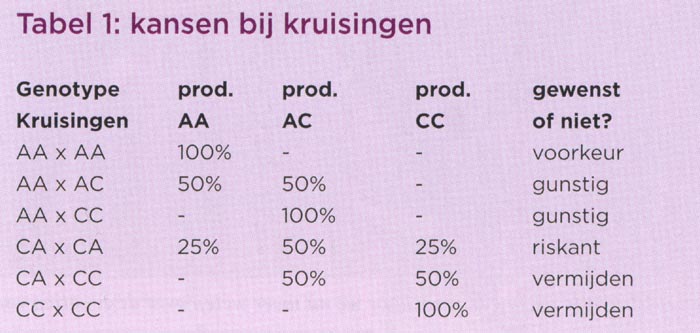 In de dressuur en de springsport heeft men liever paarden, die goed galopperen en niet gaan pacen. Daar geeft men dus de voorkeur aan CC-dieren. Maar bij ons zien we liever AA. In tabel 1 staan de kansen bij de 6 mogelijke kruisingen, waarbij AA als gewenst en CC als ongewenst wordt beschouwd.