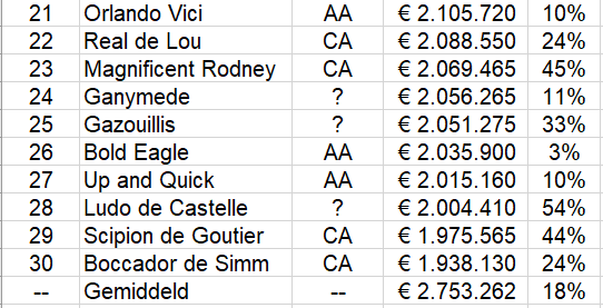 - van de 14 deelnemers in het laatste Criterium des Jeunes (voor jonge 3-jarigen) op Vincennes hadden er 10 een CA-hengst als vader of als père-de-mère. De winnaar is een zoon van van Boccador de Simm (CA). Hun deelnemende producten kunnen natuurlijk wel AA zijn, maar dat weten we niet. Feit is dat deze hengsten goed fokken.
