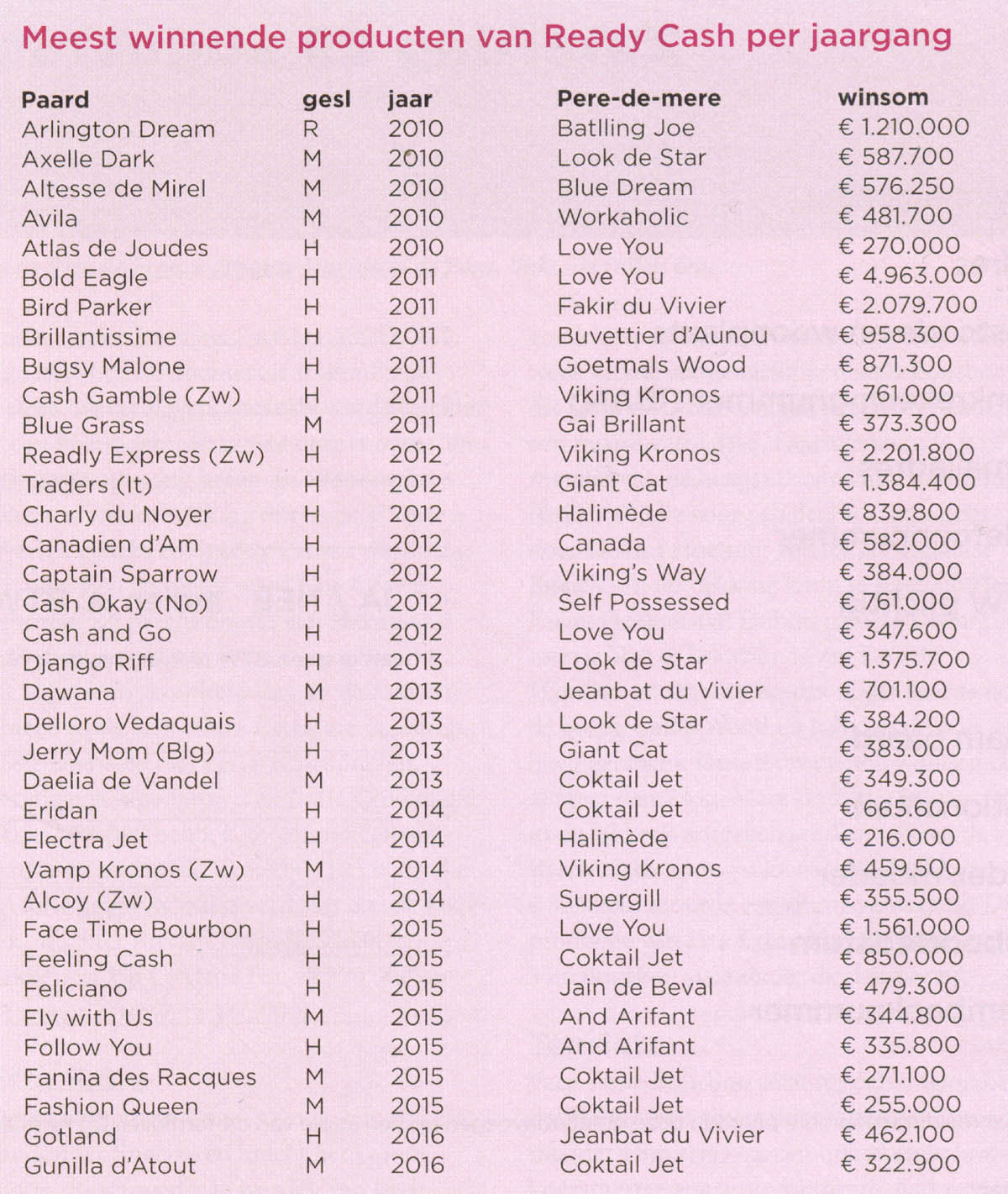Bepaalde kruisingen vallen wel op, zoals nu met Bold Eagle en zijn opvolger Face Time Bourbon, die aan de bovenkant driekwart-broers zijn. Love You was kampioen-vaderpaard voordat Ready Cash opkwam. Hij heeft ook uitstekende dochters gebracht, zoals Bélina en Uza Josselyn en Qualita Bourbon. Het was te verwachten dat hij een goede père-de-mères zou worden en dat bewijst hij inmiddels. Ook Chica des Joudes (van Jag de Bellouet) is een kleindochter van Love You. Nu de twee beste zoons van Ready Cash beide uit dochters van Love You komen, kan de vraag worden gesteld: Is dit een nieuwe Golden Cross? Love You producten hebben vaak een “lange loop” en het zijn niet echt speedpaarden. Ready Cash staat erom bekend dat hij zijn speed overbrengt op zijn producten. Zo beschouwd lijkt deze kruising een gouden combinatie. Op zoek naar de beste combinaties hebben we de meest winnende producten van Ready Cash per jaargang opgezocht via de website van Le Trot. Ze staan in de tabel en niets wijst op een bepaalde Golden Cross. Er staan meerdere volle broers/zussen in de lijst, zoals Bold Eagle en Cash and Go, Traders en Jerry Mom, Danawa en Gotland, Eridan en Gunilla d’Atout. In de laatste jaren valt vooral de kruising met Coktail Jet-dochters op, maar daar zijn er Frankrijk ook heel veel van. Viking Kronos staat viermaal in de lijst, terwijl hij juist niet zoveel kansen heeft gekregen. Met dochters van andere vaderpaarden zijn ook uitstekende dravers gefokt, zoals Bird Parker, wiens moeder al 22 jaar oud was toen hij werd geboren. Zijn père-de-mère Fakir du Vivier is geboren in 1971, precies 40 jaar vóór Bird Parker. Ook dat kan in Frankrijk.