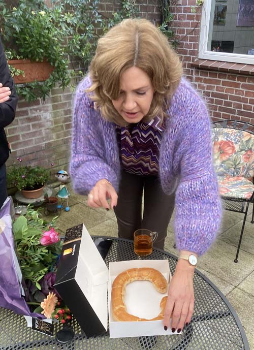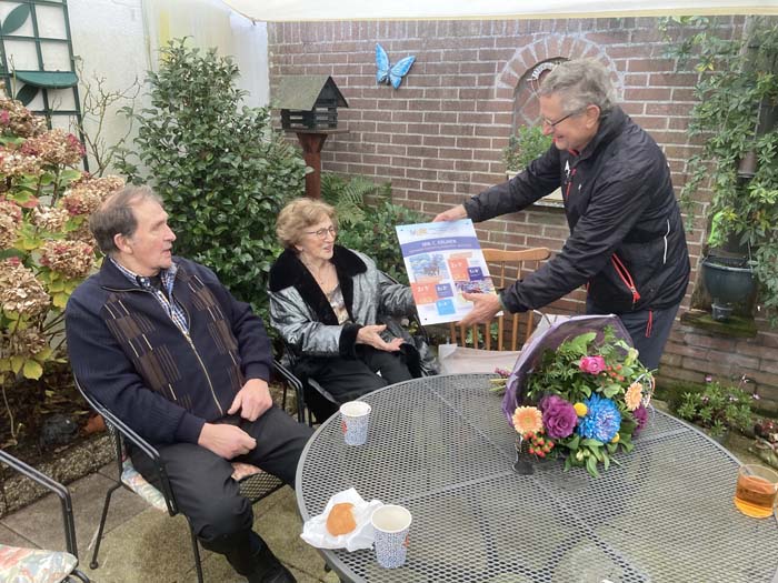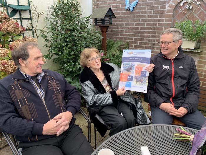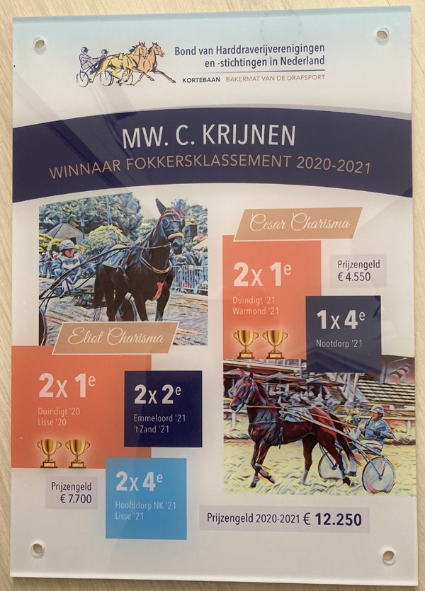 Het was oorspronkelijk de bedoeling om na afloop van de Jaarvergadering van de Bond op 23 november j.l. alle kampioenen te huldigen. Vanwege de Corona-beperkingen moest dit echter worden afgeblazen. Toch wilde het Bondsbestuur niet te lang wachten met het huldigen van de Kampioenfokker en heeft afspraken gemaakt met de familie Krijnen te Bussum. Op de middag van de afgezegde ledenvergadering ging Frans Jansen als secretaris van de Bond vanuit Wijchen naar Bussum en ik mocht er als voorzitter van de Fokkersvereniging ook bij zijn. We werden buiten naast het woonhuis ontvangen onder een groot zeildoek met een warmtekanon. Corona-proof. Er stonden al 9 mensen op ons te wachten. Fokker Tijmen (Tiep) Krijnen en zijn vrouw Catharina, twee dochters, een kleindochter en aanhang. Plus fotograaf Hans Noppen. Zoon Tijmen junior uit Groningen ontbrak wegens verplichtingen. We begonnen met koffie en een oliebol. Frans Jansen hield een speech en vertelde dat hij er in 2014 bij was toen Adonis Charisma in zijn geboorteplaats Stompwijk de kortebaan won. Hij memoreerde ook de prestaties van Eliot en Cesar Charisma in de afgelopen twee seizoenen. Twee fokproducten die vier kortebanen winnen, komt niet veel voor. Daarna overhandigde hij namens de Bond een prachtig certificaat aan Mevrouw Krijnen, die als de fokster van de paarden te boek staat. Ze kreeg ook een bos bloemen en een grote banketletter in de vorm van een C, van Charisma en Catharina. Er werden drankjes geschonken, hapjes geserveerd en herinneringen opgehaald. Het meegebrachte artikel over de familie Krijnen uit de Breeders Special van 2012 kreeg ook volop aandacht. Kortom, het was een zeer aangename bijeenkomst, die door zowel de familie als de twee bestuursleden zeer op prijs werd gesteld.