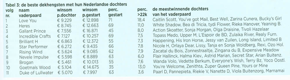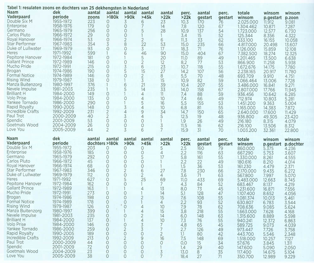 In grote tabel 1 is onderscheid gemaakt tussen de zoons en dochters van dezelfde vaderpaarden. Boven staan de zoons en onderin dochters. De hengsten staan gerangschikt op dekperiode, omdat vroegere en latere periodes soms moeilijk zijn te vergelijken. De gestarte paarden moeten tenminste een vierde prijsje hebben gewonnen. Paarden met record maar zonder winsom zijn niet meegeteld. Hiermee zijn de startpercentages berekend, die nogal verschillen en een belangrijke indicatie geven over de kwaliteiten van het vaderpaard. Daarnaast zijn de winsommen van belang en die staan in Euro’s. Het aantal producten dat meer won dan € 180.000, € 90.000, € 45.000, € 22.000 wordt aangegeven. Hier staan dus de aantallen cracks. Ook het percentage van het totale aantal producten dat meer won dan € 22.000 staat in een kolom. Hier springen er bovenuit: bij de zoons (met meer dan 15 %) Star Performer, Heres, Love You en als beste Duke of Lullwater (18,3 %) en bij de dochters zien we er ver bovenuit springen: Heres, Goetmals Wood en Love You en dat is precies zoals we verwacht hebben. De rest scoort veel lager. Ook met de gemiddelde winsommen per dochter gaan Love You en Heres ver voor de anderen uit. Gallant Prince had natuurlijk die ene uitschieter en verder scoren Brilliant H en Incredible Crafts bij de merries goed. Carlos Pluto heb ik erbij gezet vanwege zijn bijzondere moeder. De verwachting kwam uit: zijn dochters waren van gemiddelde kwaliteit en zijn zoons zaten ver onder het gemiddelde.