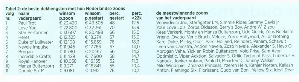 In tabel 2 staan de vaderpaarden gerangschikt in de volgorde van de gemiddelde winsom per zoon en daarachter staan hun meest winnende zoons. Koploper Paul Trot bracht 3 cracks en de vierde Sammy Davis jr verdiende ca 500.000 kronen (omgerekend ruim € 55.000) in Zweden. Als vijfde volgt Tim Trot, die € 34.500 heeft verdiend. De positie van Paul Trot is daardoor wat vertekend, maar het is wel zijn verdienste dat hij de genoemde cracks heeft voortgebracht en hij verdient daarom de eerste plaats. Love You brengt zowel cracks als veel producten in de baan en dat zien we liever. Verder in deze lijst voornamelijk Kampioen-vaderpaarden en dat is logisch. Duke of Lullwater, Nevele Impulse, Brogan en de verrassende Royal Hanover maken het elftal compleet. Van de niet genoemde dekhengsten was de gemiddelde winsom per zoon lager dan € 8.000.