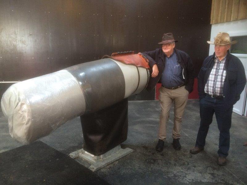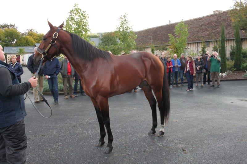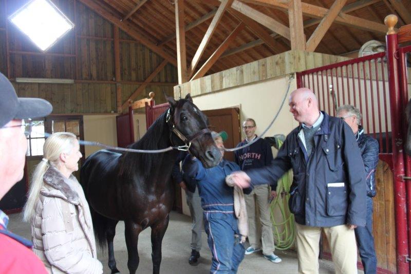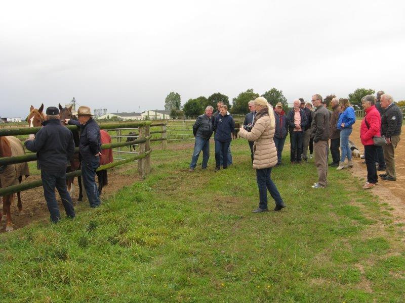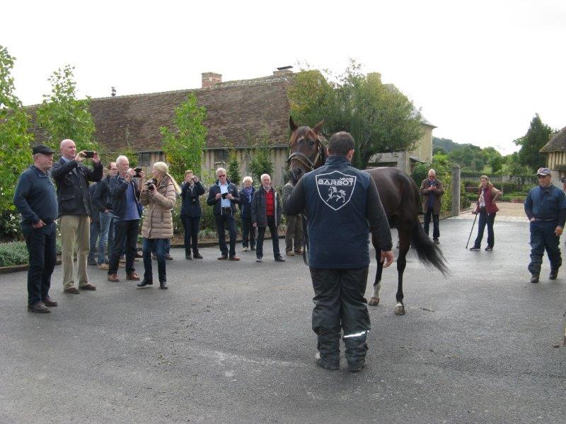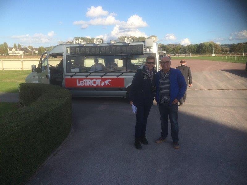 De volgende dag was er meteen al een hoogtepunt met het bezoek aan Ready Cash en zijn zoons. We werden op Ecurie Bouttemont van Philippe Allaire eerst verwelkomd met koffie, gebak en drank (Calvados) in de prachtige Normandische ontvangstruimte. Vervolgens werd het beste vaderpaard ter wereld aan ons voorgeleid. Ready Cash zag er prachtig uit na zijn ochtendwandeling voor de kar. Natuurlijk werd er een groepsfoto gemaakt. Daarna werd een aantal zoons naar buiten gebracht: Atlas de Joudes, Brillantissime, Bird Parker, Charly du Noyer en Django Riff. Fantastische dravers, en zo rustig! Allaire is zijn jaarlijkse winsten aan het investeren in nieuwe stallen (anders gaat het op aan belastingen) en een overdekte stapmolen. Indrukwekkend en mooi. We werden ook rondgeleid langs de dekstal, de trainingsstrips en de nieuwe stal. Na een uitgebreide 3-gangen lunch en een beetje ontspanning in de zon , gingen we naar de koersmeeting van Cabourg, waar een koers was vernoemd naar onze Fokkersvereniging. Bij huldiging mochten we de door ons uitgeloofde ereprijs overhandigen aan de blije eigenaar van het winnende paard en de trainer Thierry Duvaldestin, die ons nog kende van een vorig bezoek. In groepjes van twee mochten de nieuwelingen uit onze groep meerijden met de jurywagen om te zien hoe professioneel in Frankrijk wordt gejureerd.