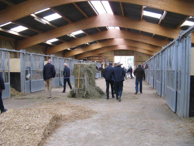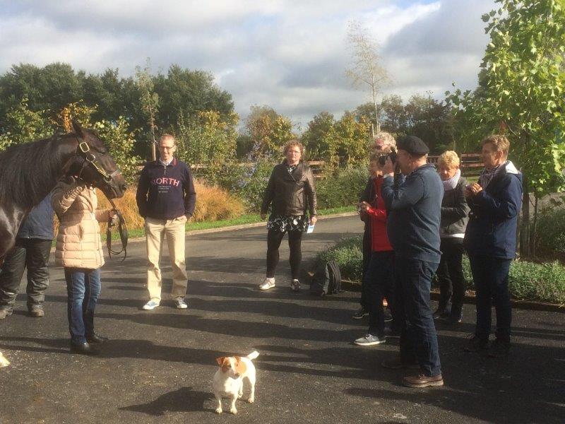 Op de derde dag moesten we wat verder reizen, maar dat was zeer de moeite waard. We gingen naar het spul van kampioen-trainer Sébastien Guarato. Ook daar kregen we eerst een dekhengstenshow. Eén voor één werden de hengsten naar buiten geleid, met commentaar van de bedrijfsleider. Onder een heerlijk zonnetje leek het wel een modeshow in een amphi-theater. We zagen onder andere Valko Genilat, Aladin d’Ecajeul, A Nous Trois, Booster Winner, Bolero Love, Che Jenilou en als uitsmijter niemand minder dan Bold Eagle. Ook met hem wilde iedereen natuurlijk op de foto en de hengst en zijn verzorger vonden dat leuk. Daarna kregen we een rondleiding over het terrein met de strip, waarop de toppers worden getraind. Extreem vals plat baan met aan beide zijden een soort rotonde waar de paarden kunnen keren. Verderop kregen we de nieuwe stal van Guarato te zien, want ook hij investeert in zijn stal en in een vergroting van zijn woonhuis. De trainers zelf hebben we alleen in het voorbijgaan gezien, want ze moeten hard werken. Wie ook hard moet werken is een Nederlandse vrouw en daar gingen we ’s middags op bezoek, na een heerlijke 4-gangen lunch met gratis wijn in Sées. Een groot contrast met de twee andere entrainementen was dat van Helena Krom en haar man Gilbert, maar dit bezoek was minstens zo leuk. We werden eerst door Heleen rondgeleid langs de paddocks, de trainingsbaan en de stallen en daarna verwend met versnaperingen en drank. Het lekkerst vonden we toch wel de speciaal door de op het terrein wonende huurbazin voor ons klaargemaakte bouillon met wodka. Daar werden we warm van en ook van het gezellig onder ons zijn op een ‘semi-Nederlands entrainement’.