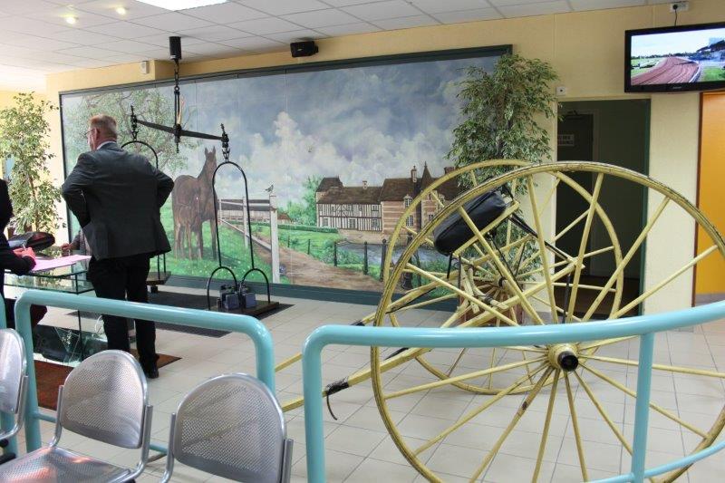 Boven: De weegruimte van Drafbaan Cabourg. Voor de monté-koersen.