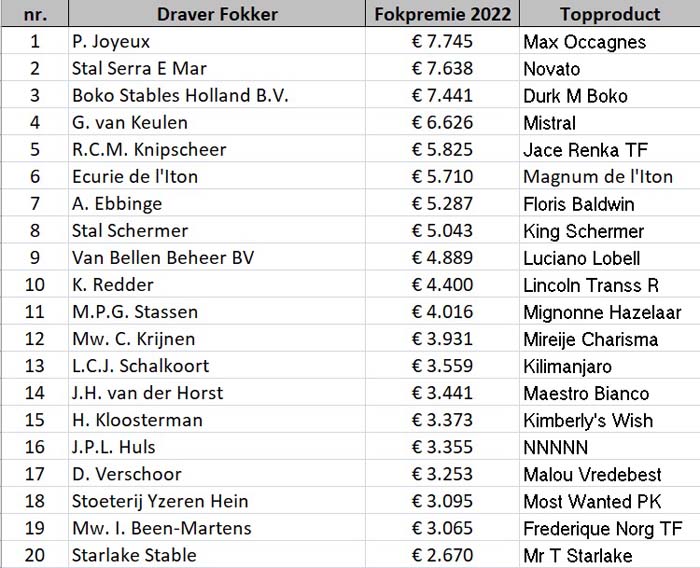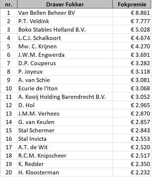 De tussenstand bij de fokkers is vorige week gepubliceerd in ons weekblad, net als die van de andere soorten van deelnemers (pikeurs, etc.). Zie hieronder. Morgen zijn er in Wolvega grote fokpremies te verdienen: € 5.000 in de TCT-3jr-Derby (3 gegadigden: Paranoh Newport, Proud to be Starro en Prins Paasloo) en € 2.500 in de TCT-3jr-Merrie-Derby (6 gegadigden w.o. Prishana Boko en Pascha Vitanova). Let op: de fokpremies schuiven door naar de hoogst geplaatste NL-paarden!! In de Giganten bedraagt de winnende fokpremie € 3.200 en die is voor de fokker van de hoogst geplaatste NL-draver bij de eerste 7 aankomenden. Hiervoor zijn de enige gegadigden Michel de Bruin en Aad van Schie met hun fokproducten Heart of Steel en Niagara River. NL-Koersen zijn tevens wedstrijden tussen NL-fokkers en dat geeft een extra stimulans voor de NL-fokkerij. Maak uw veulen NL......