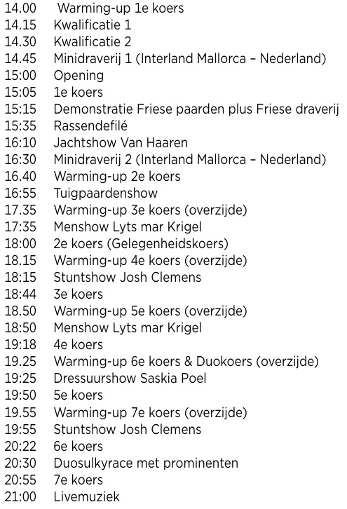 Komende zaterdag 16 aug. wordt in Wolvega gestreden om de Fokkers Trofee (4e koers, 11 deelnemers, om 19:17u) en de Merrie Trofee (5e koers, 10 deelnemers, om 19:49u). Daarna is er nog de Halve Finale van de 4-jarigen Derby (6e koers, 9 deelnemers, om 20:21u) en de Grote Prijs van Ned. (4e koers, 8 deelnemers, om 20:50u). Een prachtig programma, ook thuis te zien.