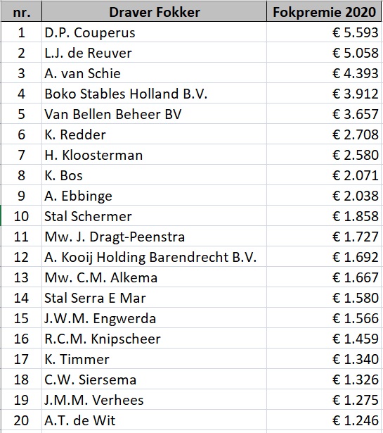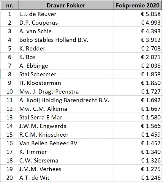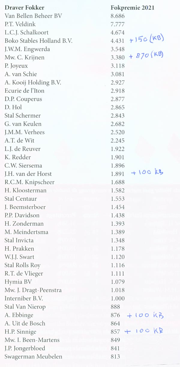 Tussenstand FOKKERS in 2021 Deze tussenstand kregen we van de NDR. Arie van Bellen heeft dankzij de Triple Crown-bonus voor Lana Lobell, goed voor € 2.000 extra fokpremie, de sprong naar de koppositie gemaakt. Die zal hij kunnen behouden, want de paarden van zijn directe achtervolgers staan op rust en Arie heeft nog de nodige starters die vorm hebben. Op 1 december zijn de fokpremies voor de kortebaan overgemaakt en die waren nog niet in de stand van de NDR verwerkt. Ze staan er hiernaast met de hand bij geschreven. |